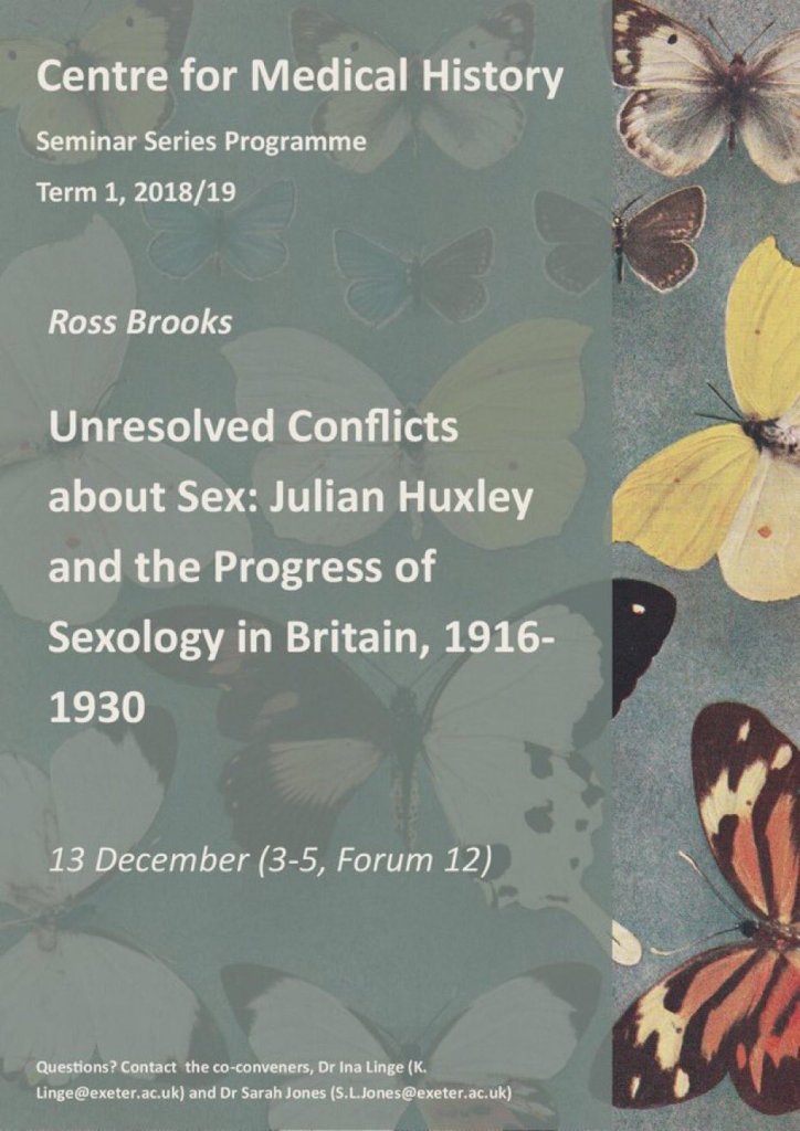 ‘Unresolved Conflicts about Sex: Julian Huxley and the Progress of Sexology in Britain, 1916–1930,’ Centre for Medical Humanities seminar series, University of Exeter, 13 December 2018